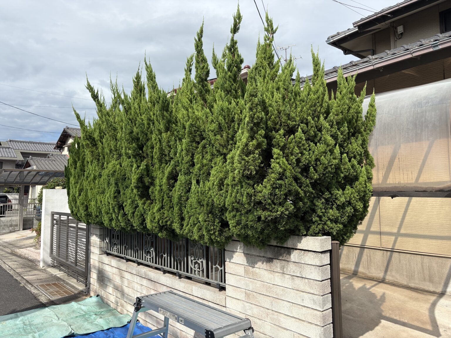 対象となったのは、敷地境界のフェンス沿いに植えられたカイヅカイブキの生垣です。お客様からは、お仕事や日々の生活が忙しく、なかなか剪定のタイミングが取れずに放置してしまったというお悩みを伺いました。気がついた時には枝葉が1階の屋根を超える高さまで成長し、フェンスを突き抜けて道路側まで大きく張り出していたため、通行人への迷惑や視界の妨げを大変心配されていました。