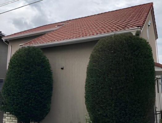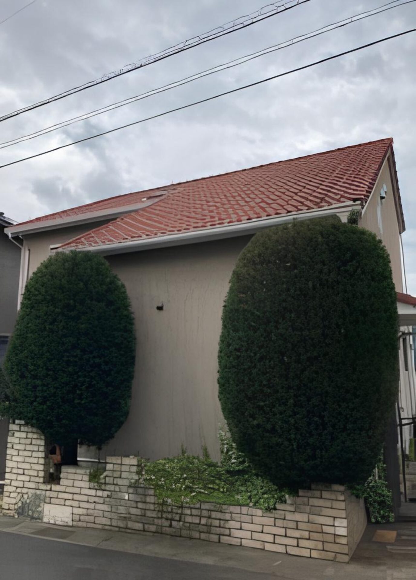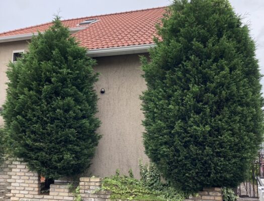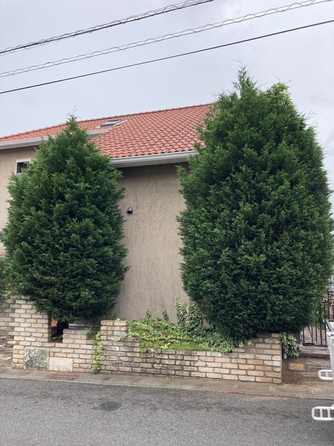 甲府市にお住まいのお客様より、庭に植えられた2本のコニファーが大きく育ちすぎたため、剪定してほしいとのご依頼をいただきました。年月の経過とともに高さと幅が出てしまい、洋風なご自宅の外構とのバランスや、通行の妨げになっている点を気にされていました。